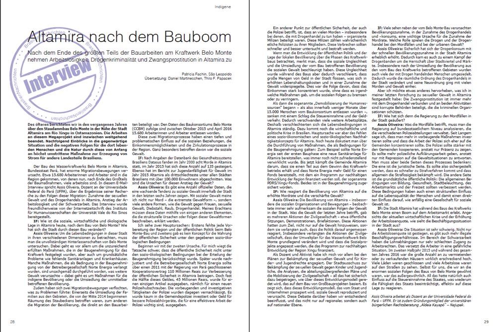 Der Bau des Wasserkraftwerks Belo Monte in Altamira, Bundesstaat Pará, hat enorme Migrationsbewegungen verursacht. Etwa 15.680 Arbeiterinnen und Arbeiter sind in die Region gekommen, von denen nun, nach Ende des Großteils der Baumaßnahmen, viele arbeitslos sind. In diesem E-Mail-Interview spricht Assis Oliveira, Dozent an der Universidade Federal do Pará (UFPA), über die Ergebnisse seiner Recherche zu den Folgen dieser Migration: Zunahme der sexuellen Gewalt und des Drogenhandels in Altamira, Anstieg der Arbeitslosigkeit und der Schwarzarbeit. Das Interview wurde freundlicherweise von der Internetzeitschrift des Instituts für Humanwissenschaften der Universität Vale do Rio Sinos bereitgestellt.