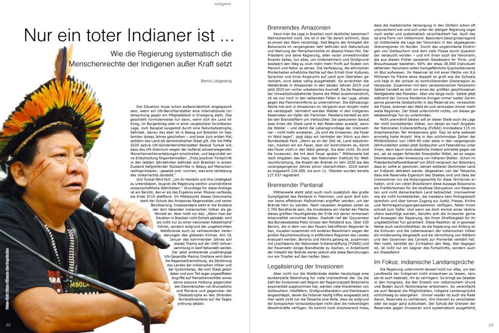 Kann man die Lage in Brasilien noch deutlicher benennen? Wahrscheinlich nicht. Sie ist in der Tat derart schlimm, dass es einem den Atem verschlägt. Seit Beginn der Amtszeit Jair Bolsonaros im vergangenen Jahr befinden sich Naturschutz und Wahrung der Menschenrechte im absolut freien Fall. Der Präsident und seine Regierung, allen voran Umweltminister Ricardo Salles, tun alles, um Unternehmern und Großgrundbesitzern den Weg zu noch mehr mehr Profit auf Kosten von Mensch und Natur zu ebnen. Die Verfassung, die ethnischen Minderheiten erhebliche Rechte auf den Erhalt ihrer Kulturen, Sprachen und ihres Anspruchs auf Land zum Überleben garantiert, wird dabei völlig ausgehebelt. So erreichten die Waldbrände in Amazonien in den beiden Jahren 2019 und jetzt 2020 ein vorher unbekanntes Ausmaß. Da die Regierung der Umweltschutzbehörde Ibama die Mittel zusammenstrich, ist sie nur noch in den seltensten Fällen in der Lage, etwas gegen das Flammeninferno zu unternehmen. Die Abholzungsfläche hat sich in Amazonien im Vergleich zum Vorjahr mehr als verdoppelt. Vermehrt werden Wälder in den indigenen Reservaten ein Opfer der Flammen. Meistens handelt es sich bei den Brandstiftern um Viehzüchter. Sie spekulieren darauf, dass ihnen der Staat Land in den Reservaten zuweist, wenn die Wälder – und damit die Lebensgrundlage der Ureinwohner – nicht mehr existieren. „Es sind die Invasoren, die Feuer im Wald legen“, sagt dazu ein Vertreter der Xikrin aus dem Bundesstaat Pará. „Wenn es an der Zeit ist, Land abzubrennen, machen wir ein Feuer, aber wir kontrollieren es, damit das Feuer nicht in den Wald gelangt. Sie aber nicht. Es sind die Invasoren, die mit dem Feuer spielen.“ Mittlerweile hat nach Angaben des Inpe, des Nationalen Instituts für Weltraumforschung, die Anzahl der Brände im Jahr 2020 die des vorangegangenen Jahres schon überschritten: 2019 waren es insgesamt 126.089, bis zum 11. Oktober wurden bereits 127.037 registriert.