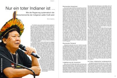 Nicht unerwähnt bleiben soll an dieser Stelle auch die Lage der nicht kontaktierten Völker, von denen es nach Angaben der Nationalen Indianerstiftung (FUNAI) mindestens 115 im brasilianischen Teil Amazoniens gibt. Das ist eine weltweit einmalig hohe Anzahl. Wie in den schlimmsten Zeiten der Militärdiktatur von 1964-85 oder etwa in den vergangenen Jahrhunderten wüten jetzt Goldsucher und Fazendeiros unter ihnen, denn kaum eine staatliche Instanz schreitet gegen sie ein, sei es wegen fehlender finanzieller Mittel, sei es wegen Desinteresse oder Anweisung von höheren Stellen. Schon im Präsidentschaftswahlkampf von 2018 versprach Jair Bolsonaro, dass er, sollte er gewinnen, keinen weiteren Zentimeter Land an Indianer abtreten werde. Abgesehen von der Tatsache, dass alle Reservate Eigentum des Staates sind und dass die Ureinwohner nur die Nutzungsrechte für diese Territorien erhalten, wird von vielen Brasilianern diese Aussage Bolsonaros als Freifahrtschein für die straflose Okkupation von Reservaten und nicht demarkiertem Land betrachtet. Ureinwohner wie die nicht kontaktierten, die meistens kein Portugiesisch sprechen und über keinen Zugang zur Justiz, Presse, Kirche und Nichtregierungsorganisationen verfügen, fallen ihnen schnell zum Opfer. Und wenn sie doch einmal eines Verbrechens bezichtigt werden, berufen sich die Invasoren gerne auf Aussagen der Regierung, die ihnen Straflosigkeit für ihr ungesetzliches Tun garantiert. Diese Reaktion ist in gewisser Weise auch nachvollziehbar, da die Regierung von Anfang an die Kulturen und die Lebensweisen der indianischen Völker als minderwertig dargestellt und die Vernichtung von Wäldern und den Savannen des Cerrado zur Pioniertat verklärt hat: Wer rodet, bereitet der Zivilisation den Weg. Wer dagegen ist, ist nicht nur ein Gegner des Fortschritts, sondern auch ein Staatsfeind