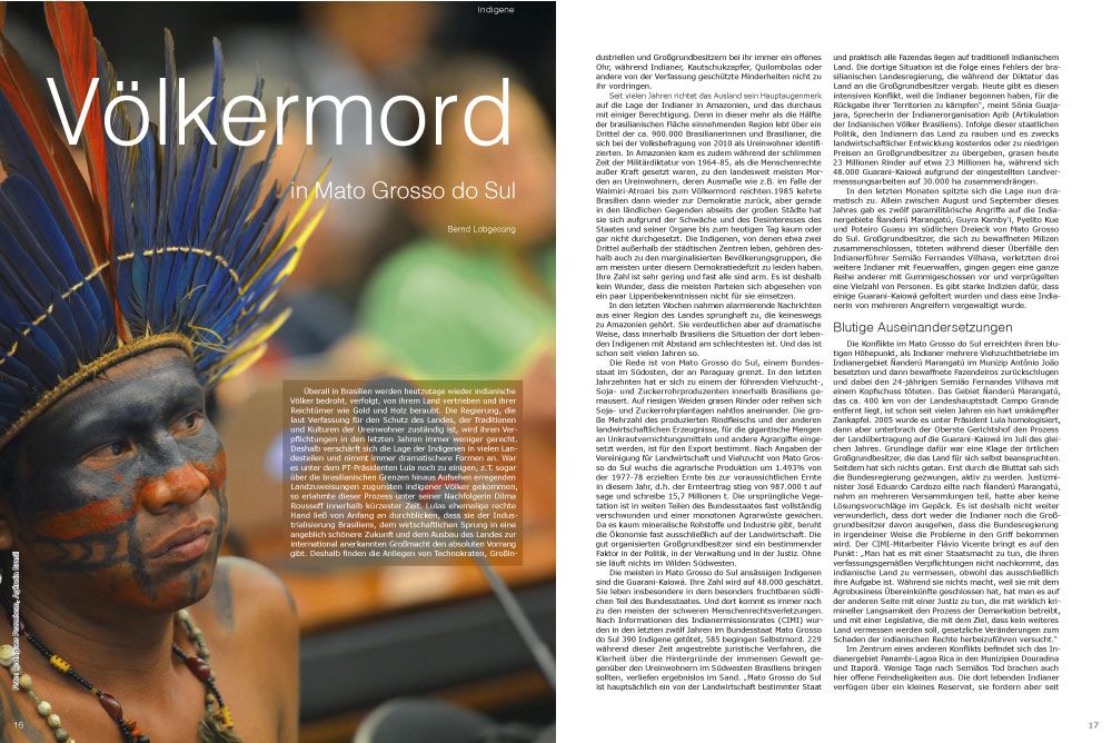 In den letzten Monaten spitzte sich die Lage nun dramatisch zu. Allein zwischen August und September dieses Jahres gab es zwölf paramilitärische Angriffe auf die Indianergebiete Ñanderú Marangatú, Guyra Kamby‘i, Pyelito Kue und Poteiro Guasu im südlichen Dreieck von Mato Grosso do Sul. Großgrundbesitzer, die sich zu bewaffneten Milizen zusammenschlossen, töteten während dieser Überfälle den Indianerführer Semião Fernandes Vilhava, verletzten drei weitere Indianer mit Feuerwaffen, gingen gegen eine ganze Reihe anderer mit Gummigeschossen vor und verprügelten eine Vielzahl von Personen. Es gibt starke Indizien dafür, dass einige Guarani-Kaiowá gefoltert wurden und dass eine Indianerin von mehreren Angreifern vergewaltigt wurde.