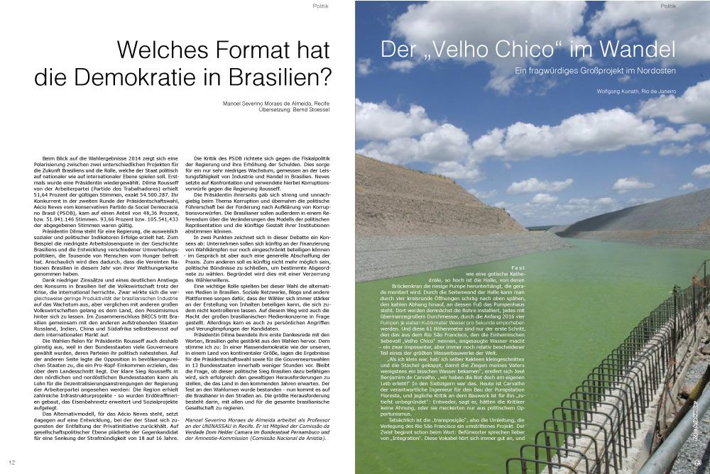 „Vergleichen Sie das Projekt mit der deutschen Wiedervereinigung“, rät Carvalho. Das hört sich abwegig an. Aber für den Nordosten Brasiliens und seine Bewohner kommen die beiden Kanäle einer Aufwertung der Region gleich, auf die man im entwickelten Süden traditionell herabschaut – mit einer Abschätzigkeit, die mitunter durchaus rassistische Züge annimmt. „Der Süden muss endlich verstehen, dass er den Nordosten für die Jahrhunderte lange Vernachlässigung entschädigen muss“, sagt Carvalho. Tatsächlich galt der Nordosten stets als das Armenhaus Brasiliens. Während sich der Süden entwickelte und modernisierte, wurde die Rückständigkeit des Nordostens in Film, Musik und Literatur zu einer speziellen Exotik der Armut ästhetisiert.