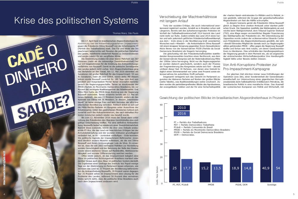 Offen bleibt jedoch, ob das Impeachment lediglich eine Zäsur im politischen Richtungsstreit Brasiliens markiert oder darüber hinaus auch eine Zäsur im politischen System darstellt. Die Ergebnisse einer Umfrage des Instituts Vox Populi wenige Tage vor der Abstimmung im Parlament lassen erkennen, wie zerrissen das Land ist. 57 Prozent der Bevölkerung befürworteten die Amtsenthebung Rousseffs, 39 Prozent waren dagegen. Nur 35 Prozent sehen im Impeachment eine Lösung für die Probleme des Landes, während 58 Prozent dies verneinen. Vieles spricht dafür, dass die politische Krise Brasiliens auch nach dem Impeachment andauern wird.