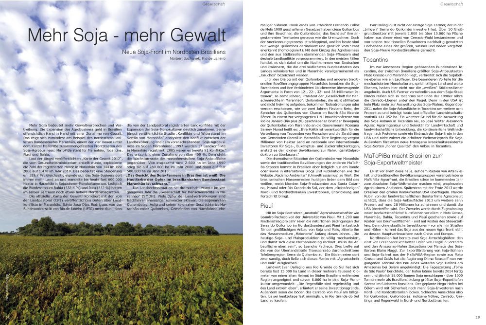 Laut der jüngst veröffentlichten „Karte der Gewalt 2012“, die vom Gesundheitsministerium erstellt wurde, explodierte die Zahl der registrierten Morde in Maranhão von 344 im Jahr 2000 auf 1.478 im Jahr 2010. Das bedeutet eine Steigerung um 329,7 % . Gleichzeitig eignete sich das Soja-Business dort immer mehr Land an und wandelte bis heute fast 600.000 Hektar in Maranhão in Sojabohnen-Monokulturen um. Lediglich die Bundesstaaten Bahia (332,4 %) und Pará (332 %) hatten im selben Zeitraum noch etwas höhere Mordanstiegsraten.