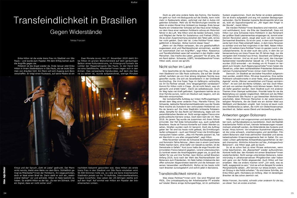 Die meisten Politiker*innen Brasiliens sind männlich, weiß und wohlhabend, kurz: die Elite der Gesellschaft. Dass mit Hilton nun eine Schwarze trans Politikerin in das Parlament der größten Stadt Lateinamerikas eingezogen ist, kommt einer kleinen Revolution gleich, zeugt aber auch von der inneren Zerrissenheit Brasiliens. Es ist ein Land, in dem sich Marginalisierte hart ihren Platz erkämpft haben, in dem trans Personen so sichtbar sind wie fast nirgendwo in der Welt. Neben Hilton zogen 30 weitere trans Politiker*innen im ganzen Land in die Lokalparlamente. Es ist aber auch das Land, in dem die Lebenserwartung von trans Frauen bei 35 Jahren liegt, nur die wenigsten dem Kreislauf aus Armut, Sexarbeit und Gefängnis entfliehen können. Und es ist auch das Land, das trauriger Spitzenreiter transfeindlicher Gewalt ist. 175 trans Frauen wurden 2020 ermordet – ein Anstieg um 41 Prozent im Vergleich zum Vorjahr. Auch Regierungsvertreter*innen heizen die Gewalt an, unter dem rechtsradikalen Präsidenten Bolsonaro nehmen Fundamentalist*innen immer mehr Einfluss.
