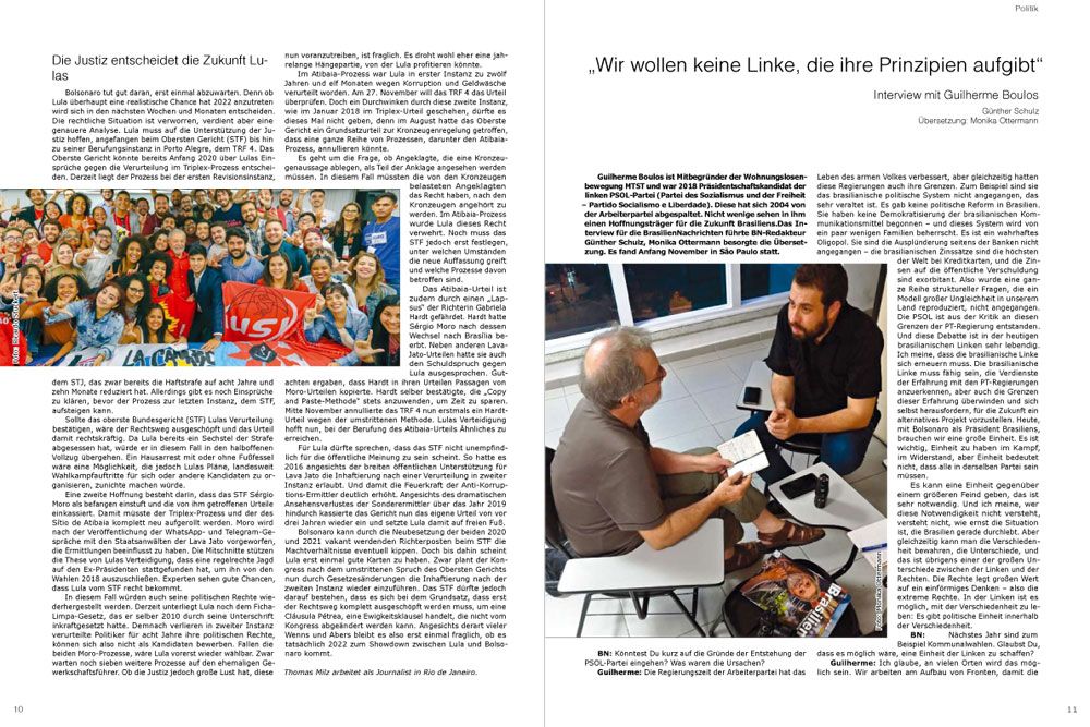 BN: Es wäre gut, wenn das passieren würde. Noch zu Lula, zuerst zu seiner Gefangenschaft: Was meinst Du, wie steht die Chance, dass er aus dem Gefängnis kommt? Und die andere Frage: die Chance, dass er wieder in die Politik zurückkehrt?