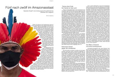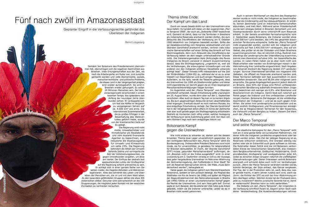 1.200.000 km² Land besitzen, das 14% des gesamten brasilianischen Territoriums entspräche. Sollte der „Marco Temporal“ nicht angewendet werden, würden sich die indigenen Landansprüche auf fast 2.400.000 km² verdoppeln, also auf ein Gebiet, das größer ist als der Südosten und Osten Brasiliens zusammengenommen. Das ist natürlich Unfug. Rechnet man allerdings die Landansprüche der Urbevölkerung zusammen, kommt man theoretisch auf etwa 14% der Gesamtfläche des Landes. In vielen Fällen haben sie es aber noch nicht vom Staat erhalten oder werden von Eindringlingen massiv in der Wahrnehmung ihrer Landrechte eingeschränkt. Nach Angaben von Adveniat blockiert die Regierung derzeit 237 Landzuteilungen. Survival International berichtet von insgesamt 690 Gebieten, die offiziell als Reservate anerkannt worden sind. Diese Territorien befinden sich fast ausschließlich im dünn besiedelten Amazonien. Das sind 98,5% aller indigenen Landansprüche. Die ganze Angelegenheit gewinnt jedoch dadurch an Brisanz, dass 50% der knapp eine Million umfassenden indianischen Bevölkerung außerhalb Amazoniens leben. Insgesamt bezeichnen sich weniger als 0,5% aller Brasilianer und Brasilianerinnen als Indigene. Damit lässt sich natürlich gut Politik gegen die Indianer und ihre umfassenden Landforderungen machen. Bolsonaros Ziel dagegen ist die vollständige Assimilation der Indigenen – und sei es auch gegen ihren Willen. Sie sollen ihre Landansprüche zurückstecken und es damit endlich Großagrariern und Minenkonzernen ermöglichen, die so freigewordenen Territorien für den Sojaanbau, die Viehzucht und den Bergbau zu nutzen. Diesem Ziel dient auch der „Marco Temporal“.