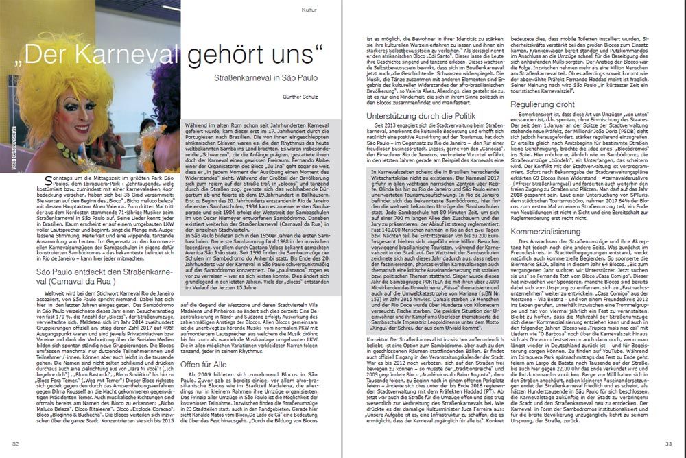 Weltweit wird bei dem Stichwort Karneval Rio de Janeiro assoziiert, von São Paulo spricht niemand. Dabei hat sich hier in den letzten Jahren einiges getan. Das Sambódromo in São Paulo verzeichnete dieses Jahr einen Besucheranstieg von fast 170 %, die Anzahl der „Blocos“, der Straßenumzüge, vervielfachte sich. Meldeten sich im Jahr 2014 zweihundert Gruppierungen offiziell an, stieg deren Zahl 2017 auf 495! Ausgangspunkt waren und sind jeweils Privatinitiativen bzw. Vereine und dank der Verbreitung über die Sozialen Medien bilden sich spontan ständig neue Gruppierungen. Die Blocos umfassen manchmal nur dutzende Teilnehmerinnen und Teilnehmer /-innen, können aber auch leicht in die tausende gehen. Die Namen sind nicht selten schillernd und drücken durchaus auch eine Zielrichtung aus von „Tara Ni Você“! („Ich begehre dich“) , „Bloco Bastardo“, „Bloco Soviético“ bis hin zu „Bloco Fora Temer.“ („Weg mit Temer“) Dieser Bloco richtete sich gezielt gegen den durch das Amtsenthebungsverfahren gegen Dilma Rousseff an die Macht gekommenen gegenwärtigen Präsidenten Temer. Auch musikalische Richtungen sind oftmals bereits am Namen des Bloco zu erkennen: „Bicho Maluco Beleza“, Bloco Ritaleena“, Bloco „Explode Coracao“, Bloco „Bloqinho & Buchecha“. Die Blocos verteilen sich inzwischen über die ganze Stadt. Konzentrierten sie sich bis 2015 auf die Gegend der Westzone und deren Stadtvierteln Vila Madalena und Pinheiros, so ändert sich dies derzeit: Eine Dezentralisierung in Nord- und Südzone erfolgt, Auswirkung des zahlenmäßigen Anstiegs der Blocos. Allen Blocos gemeinsam ist die unentwegt zu hörende Musik: vom normalem PKW mit aufmontiertem Lautsprecher aus welchem die Musik dröhnt bis hin zum als wandelnde Musikanlage umgebauten LKW. Die in allen möglichen Variationen verkleideten Narren folgen tanzend, jeder in seinem Rhythmus.