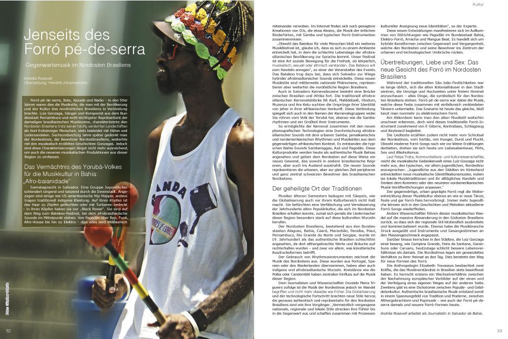 Samstagnacht in Salvador. Eine Gruppe Jugendlicher schlendert singend und tanzend durch die Innenstadt. Angezogen sind einige wie US-amerikanische Hip-Hopper, andere tragen traditionell indigene Kleidung. Auf ihren Köpfen ist das Haar zu Zöpfen geflochten oder mit Turbanen bedeckt – in ihren Köpfen haben sie nur „Black Power“. Sie sind auf dem Weg zum Batekoo-Festival, bei dem afrobrasilianische Sounds im Mittelpunkt stehen. Von Pagodão über Rap, Funk, Afro-House bis hin zu Elektro – dies alles wird musikalisch miteinander verwoben. Im Internet finden sich noch gewagtere Kreationen von DJs, die etwa Aboios, die Musik der örtlichen Rinderhirten, mit Samba und typischen Forró-Instrumenten zusammenmixen.