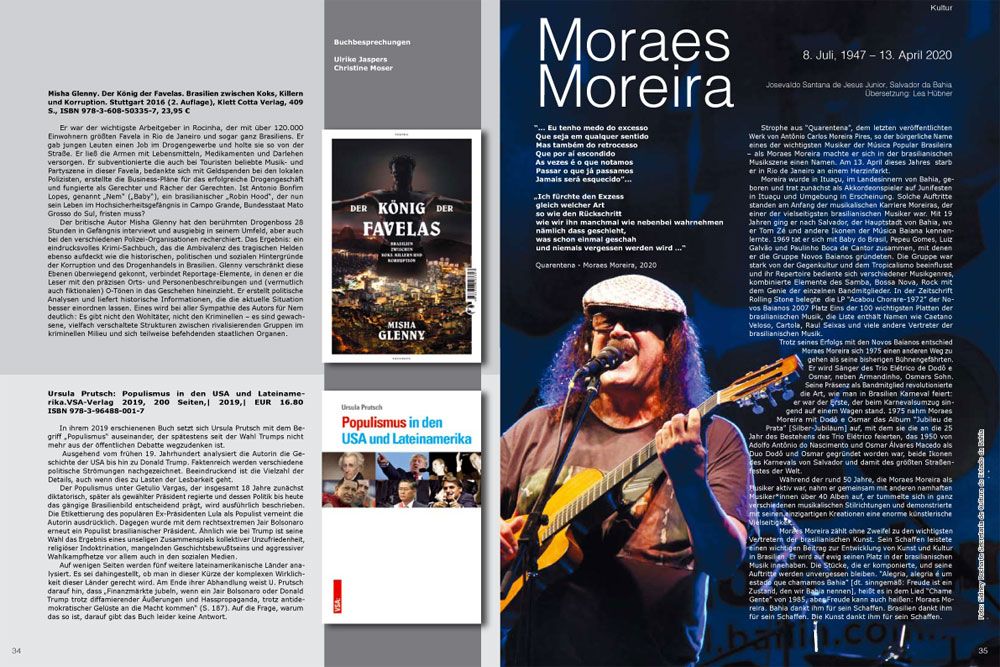 Strophe aus “Quarentena”, dem letzten veröffentlichten Werk von Antônio Carlos Moreira Pires, so der bürgerliche Name eines der wichtigsten Musiker der Música Popular Brasileira – als Moraes Moreira machte er sich in der brasilianischen Musikszene einen Namen. Am 13. April dieses Jahres starb er in Rio de Janeiro an einem Herzinfarkt.