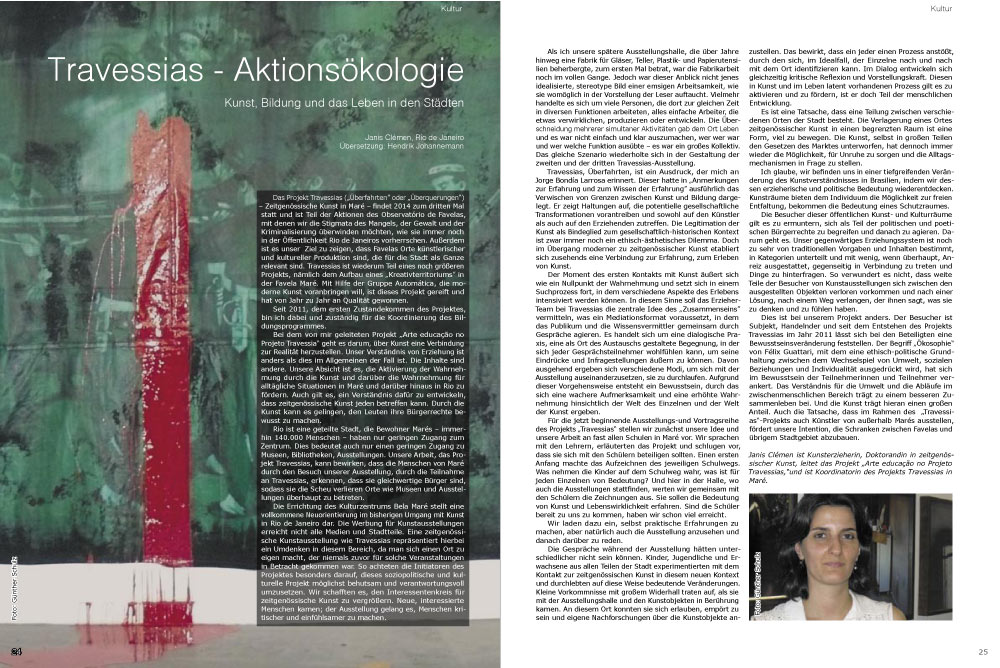 Das Projekt Travessias („Überfahrten” oder „Überquerungen“) – Zeitgenössische Kunst in Maré – findet 2014 zum dritten Mal statt und ist Teil der Aktionen des Observatório de Favelas, mit denen wir die Stigmata des Mangels, der Gewalt und der Kriminalisierung überwinden möchten, wie sie immer noch in der Öffentlichkeit Rio de Janeiros vorherrschen. Außerdem ist es unser Ziel zu zeigen, dass Favelas Orte künstlerischer und kultureller Produktion sind, die für die Stadt als Ganze relevant sind.