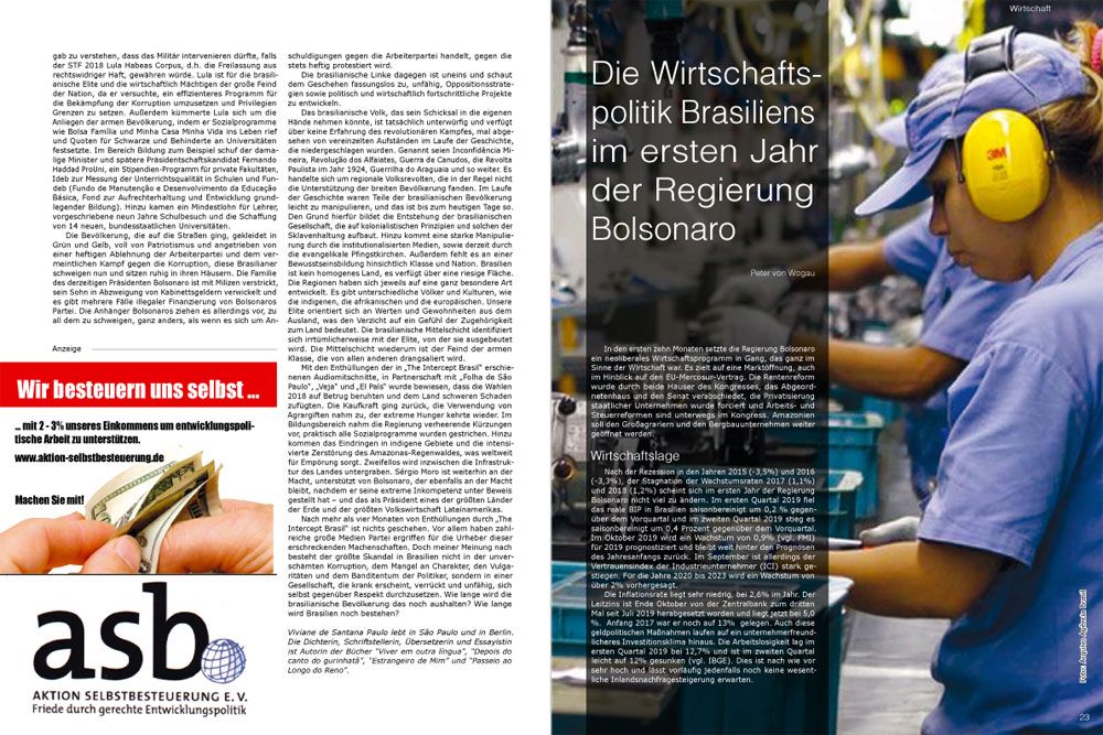 Inwieweit sich die neoliberale Wirtschaftspolitik der Regierung Bolsonaro insgesamt durchsetzt, ist noch offen. Negative Konsequenzen einer solchen Politik zeigen sich in Ländern wie Chile und Ecuador, wo es massive Gegenbewegungen gegen die Folgen dieser Politik gibt, welche die sozialen Diskrepanzen unerträglich verschärft haben. Da Bolsonaro nach Auseinandersetzungen in der Regierungspartei im November beschloss, eine eigene Partei (Aliança pelo Brasil / Allianz für Brasilien) zu gründen, ist zur Zeit auch noch nicht klar, wie er im Kongress parlamentarische Mehrheiten findet.