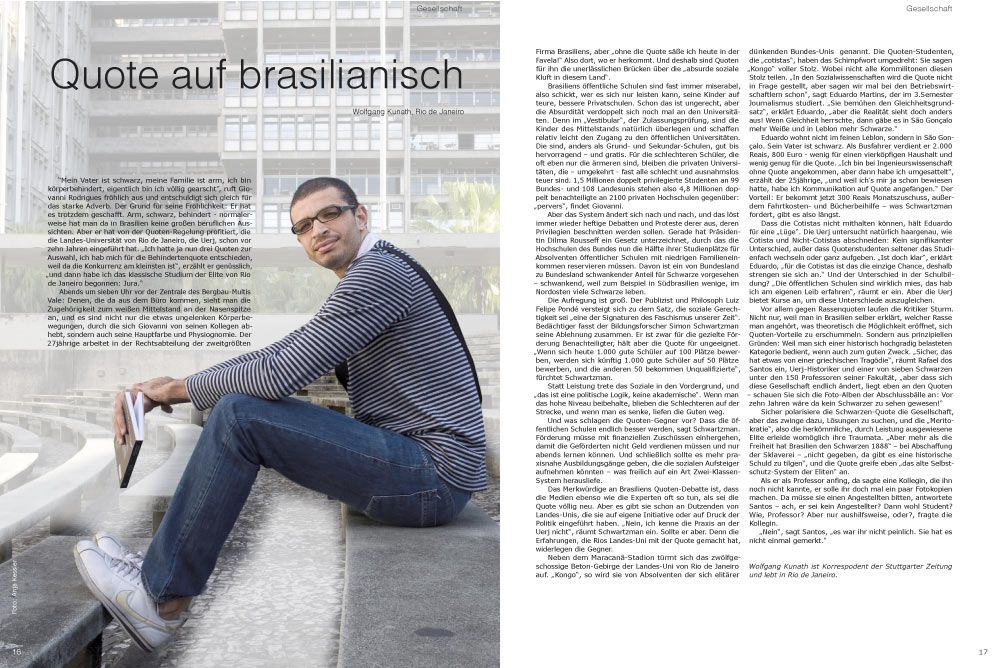 Abends um sieben Uhr vor der Zentrale des Bergbau-Multis Vale: Denen, die da aus dem Büro kommen, sieht man die Zugehörigkeit zum weißen Mittelstand an der Nasenspitze an, und es sind nicht nur die etwas ungelenken Körperbewegungen, durch die sich Giovanni von seinen Kollegen abhebt, sondern auch seine Hauptfarbe und Physiognomie. Der 27jährige arbeitet in der Rechtsabteilung der zweitgrößten Firma Brasiliens, aber „ohne die Quote säße ich heute in der Favela!“ Also dort, wo er herkommt. Und deshalb sind Quoten für ihn die unerlässlichen Brücken über die „absurde soziale Kluft in diesem Land“.