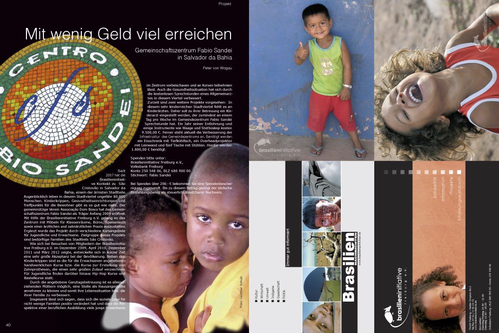 Seit 2007 hat die brasilieninitiative f r e i b u r g e.V. Kontakt zu São Cristovão in Salvador da Bahia, einem der ärmsten Stadtteile. Augenblicklich leben in diesem Stadtviertel ungefähr 80.000 Menschen. Kinderkrippen, Gesundheitseinrichtungen und Treffpunkte für die Bewohner gibt es so gut wie nicht. Der gemeinnützige Verein Associação Dom Bosco hat das Gemeinschaftszentrum Fabio Sandei als Träger Anfang 2009 eröffnet. Mit Hilfe der brasilieninitiative f r e i b u r g e.V. gelang es das Zentrum mit Möbeln für Klassenräume, Büros, Speiseraum sowie einer ärztlichen und zahnärztlichen Praxis auszustatten. Ergänzt wurde das Projekt durch verschiedene Kursangebote für Jugendliche und Erwachsene. Zielgruppe dieses Projekts sind bedürftige Familien des Stadtteils São Cristovão.