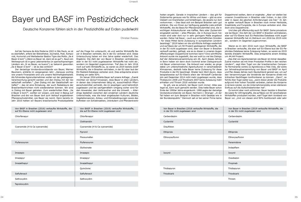 Waren es im Jahr 2016 noch neun Wirkstoffe, die BASF in Brasilien verkaufte, die aber auf EU-Ebene laut der EU-Pesticides-Database keine Zulassung haben, so waren es 2019 bereits dreizehn Wirkstoffe. Dies entspräche einem Anstieg um 44,44 Prozent.