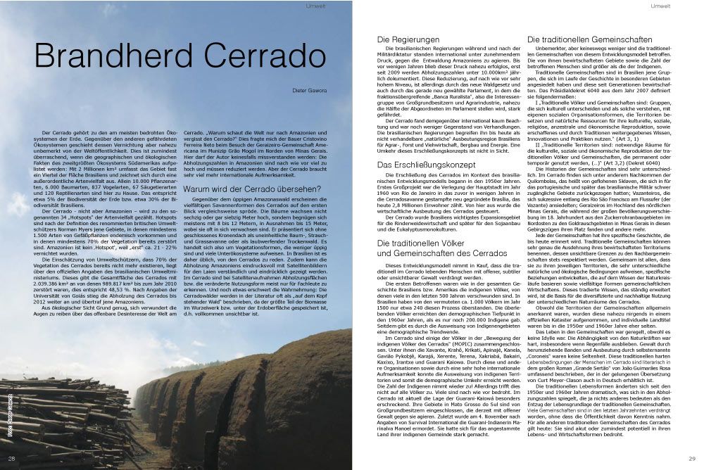 Das alles sind mehr als genug Gründe, um sich mit dem Cerrado intensiver auseinander zu setzen. In diesen BrasilienNachrichten versuchen verschiedene Autorinnen und Autoren, die meisten davon aus dem Cerrado Brasiliens, diese Großregion ihres Landes den Lesern näher zu bringen. Sie erklären das Ökosystem, kommentieren eine ambivalente Regierungspolitik, beschreiben die vielfältigen Konflikte und stellen der deutschsprachigen Leserschaft seine Bewohner und deren Widerstandsstrategien vor.