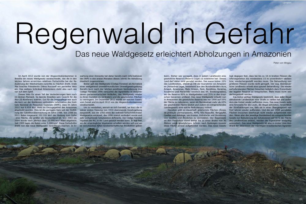 Im April 2012 wurde von der Abgeordnetenkammer in Brasília ein neues Waldgesetz verabschiedet, das die in den letzten Jahren erreichten relativen Fortschritte bei der Reduzierung der Waldverluste zunichte zu machen droht. Ende Mai brachte Präsidentin Dilma Rousseff ein partielles Veto ein. Das weitere Schicksal Amazoniens steht also nach wie vor auf dem Spiel.